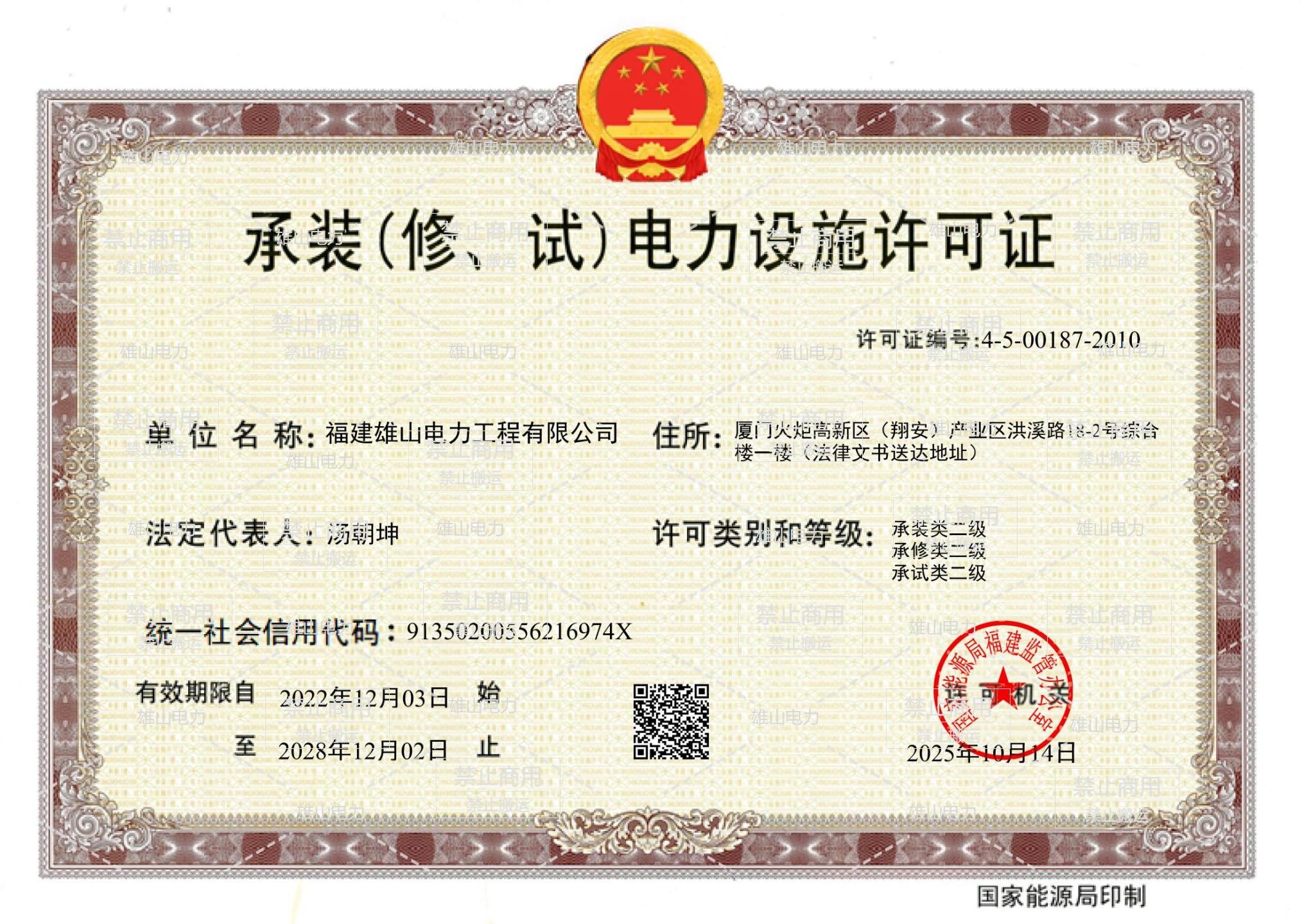 福建省住建厅颁发:电力工程施工总承包二级 厦门市住建局颁发:输变电工程专业承包二级、建筑机电安装工程专业承包二级